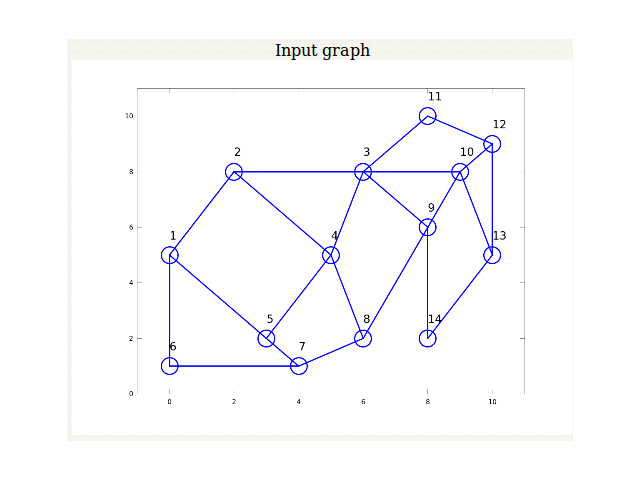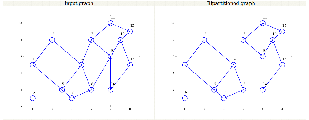 Figure 4 illustrates a graph with 14 nodes before the process of annealing. Figure 5 shows the input graph and the bipartitioned graph.